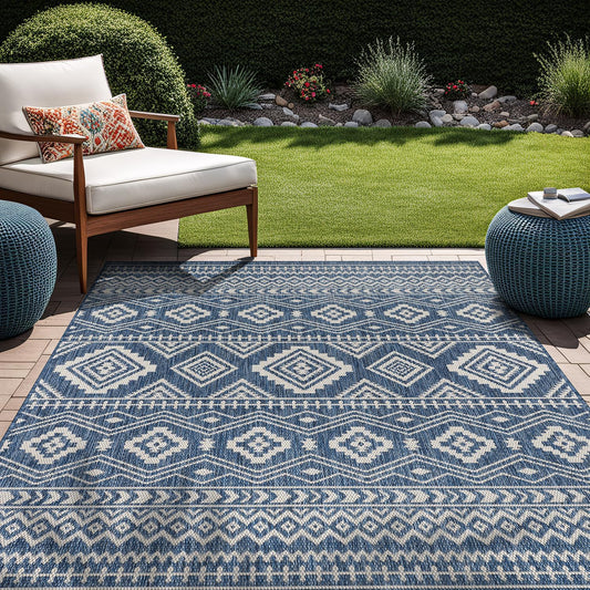 Waikiki Boho Indoor Outdoor Rug 5X7, Washable outside Carpet for Patio, Deck, Porch, Bohemian Area Rug, Farmhouse Rugs, Aztec Tribal Rug, Azure and White